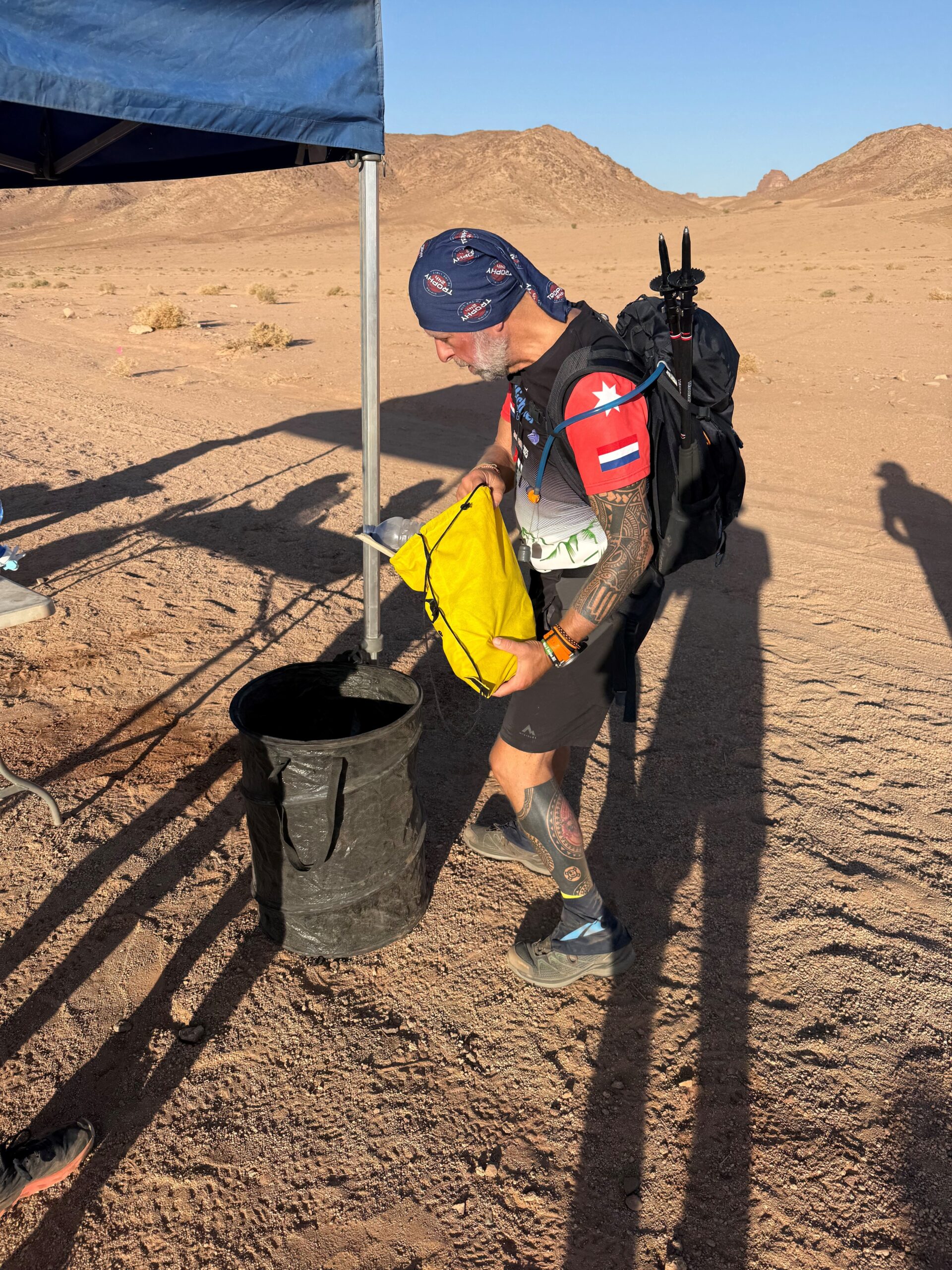 Every seven kilometers, there was a rest stop where we filled our water bottles and a medic assessed whether it was safe to continue. There was also a garbage bin for our own waste. The organization was very concerned about the environment and emphasized to us every day not to leave anything behind in the desert. So they were even more appreciative when I arrived at each rest stop with a shopping bag full of trash. And that others were inspired by this and helped me. I took everything I could fit along the way. And I always mentioned that I was doing this as a Rotarian for EndPlasticSoup.